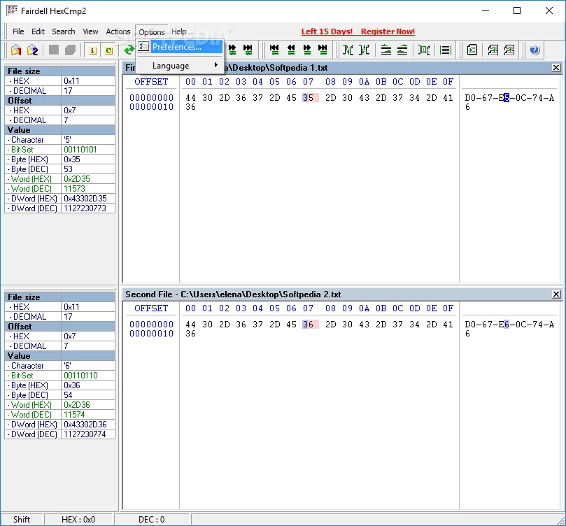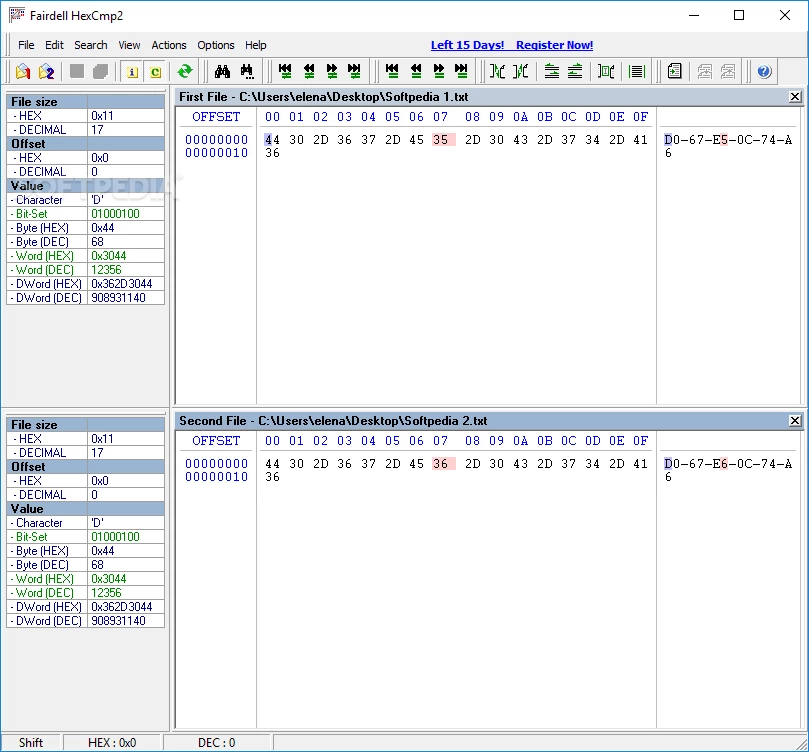 L'interface est simple et offre une navigation rapide entre les différentes fonctionnalités. Malheureusement, la fonction glisser-déposer n'est pas prise en charge ; vous devez donc utiliser un explorateur de fichiers pour ouvrir un fichier. Les valeurs inconnues sont surlignées en rouge dans les deux fichiers ; cliquez simplement sur la valeur disponible dans le code hexadécimal pour obtenir des informations utiles, comme les valeurs hexadécimales et décimales, les caractères correspondants, le mot-clé DWord et le bit défini.